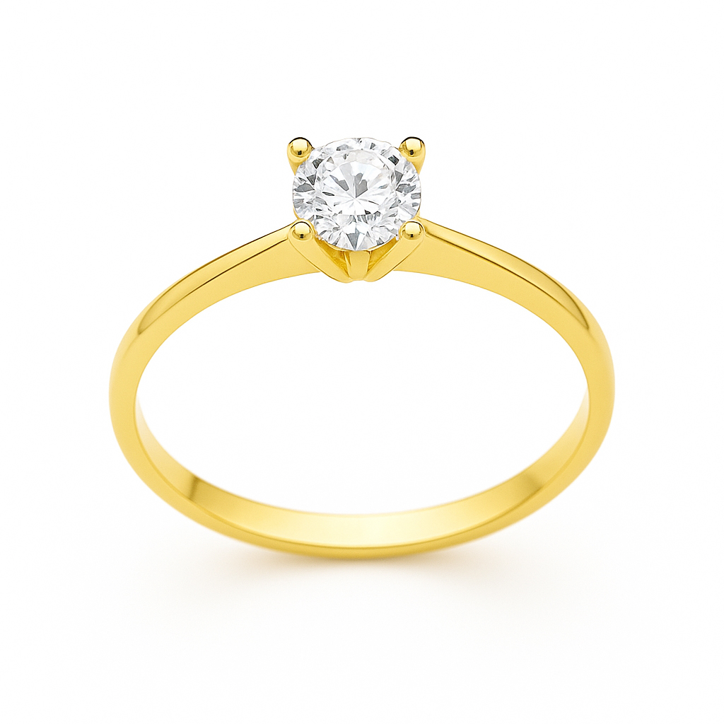 Anillo de compromiso solitario con engaste central redondo de cristal, sin duda un modelo que te enamorará a primera vista, elaborado en Oro 18K.